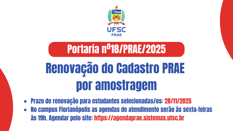 | Cadastro PRAE | Portaria Nº 18/PRAE/2025 - Renovação por Amostragem | Resolve estabelecer o processo de renovação do cadastro PRAE por amostragem por meio do Departamento de Permanência Estudantil tendo em vista o prazo de validade do cadastro PRAE de 05 (cinco) anos. |